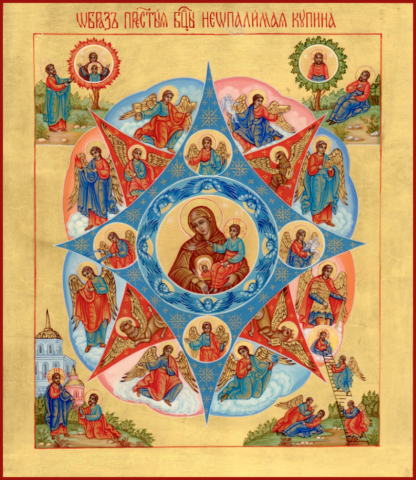 Звезда составлена из двух четыреугольников. Один окрашивается в красный цвет — во образ пламени, другой, напоминая зелень таинственного куста, — в зеленый. В углах иконы — четыре символа, упоминаемые в Апокалипсисе Иоанна Богослова: человек, лев, телец и орел, а также архангелы с теми символами, какие усваивает им церковное предание, — Михаил с жезлом, Рафаил с алавастром, Уриил с огненным мечом, Селафиил с кадилом, Варахиил с виноградным гроздием и Гавриил с ветвью благовестия. В руках Пречистой Девы помещается еще иногда, кроме Младенца, лествица, прислоненная верхним концом к плечу Богоматери — знамение того, что Она возвела человечество от земли на Небо. Пишут иногда еще врата и жезл — символ Спасителя, называемого в церковных песнях «жезлом от корня Иесеева».